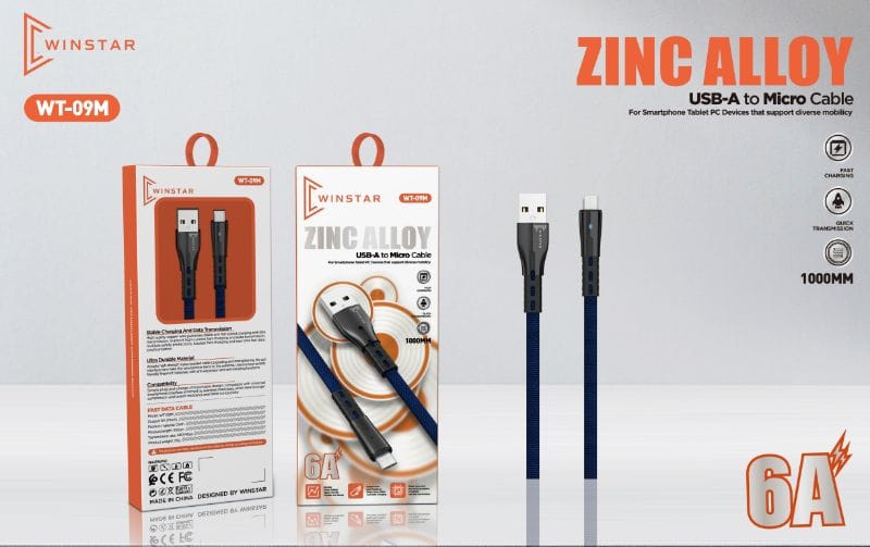 Câble Micro USB Winstar WT-09M – Charge rapide 6A, 1m, alliage zinc, tressé
